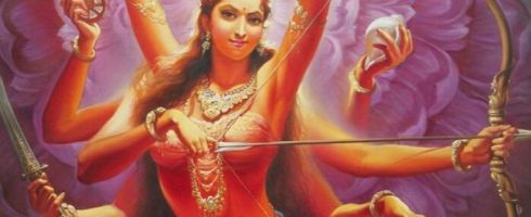 Dhanu Ranu Sanga – Devi looks beautiful holding the Bow, Ranakshana Sanga – One who uses her weapons as per the rules of the war, Parishpura Dhanga – Creates a divine aura as she holds with balance and poise her bow and arrows, Natak Katake – The sound from her bow and the entire atmosphere makes it feel more like a dance performance than a war, Kanaka Pishanga – The enemy showers on her red and golden arrows, Prishatka Nishanga – She responds to some and ignores the rest with Sringara rasa, Rasadh Bhata Shringa – Devi’s use of arrows and her response makes the whole performance look like a divine dance, Hathaa Vatuke – She is an expert in finishing off her enemies even with this grace, Kritha Chaturanga – Single handedly addresses 4 armies of the enemy, Balakshiti Ranga – One who weakens the enemy, Ghatad Bahuranga – Demolishes the wicked Asuras in different hues , Ratad Batuke – Her supremacy is complete, She is in total command, She is almighty.