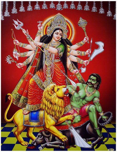 “Mahishasura Mardhini” means one who killed the Asura Mahishasura and refers to Goddess Durga. The demon was in the form of a buffalo and hence the name “Mahish Asura”. She was created by the Gods to eradicate evil and many Asuras and Dhanavas were killed by her.