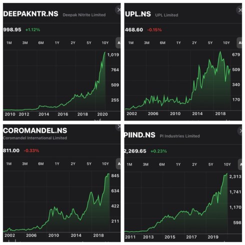Agriculture – The country is agrarian. Just like Pharma, India is home to many companies that specialises in pesticides/ fertilisers/ seeds / Tillers, here are a few star performers of this industry. Given the small land holding in India where tractors cannot be used VST Tillers is another great idea to explore.