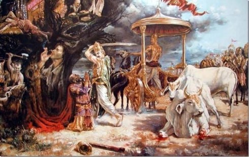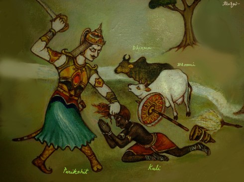 King Parikshit (Son of Ahibamanyu) spots this terrible action and rushes to the scene. He has tears in his eyes seeing the Bull & the Cow. He comforts them and says he is going to get rid of this evil man. In a terrible voice he thunders at the assailant – “In my land how dare you commit such an atrocity”.