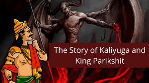 The King then charges towards the perpetrator of the crime who immediately sheds his disguise and drops at the feet of the King. He is Kali (Kali Yuga). Unable to kill a person who has fallen at his feet the king banishes Kali from his kingdom.