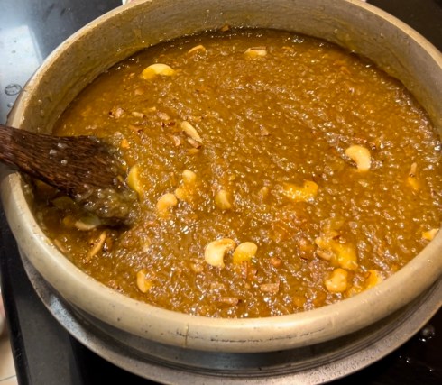 6. About 50 min to 1 hr. from process start (i.e. Step 3 – starting to cook rice), the rice and jaggery mixture should be nice and relatively viscous. At this point start adding the ghee and keep stirring. The ghee now needs to get absorbed in the rice. Adding the entire 250 – 350 ml of ghee with stirring will take about 20 minutes and the mixture should be viscous again.